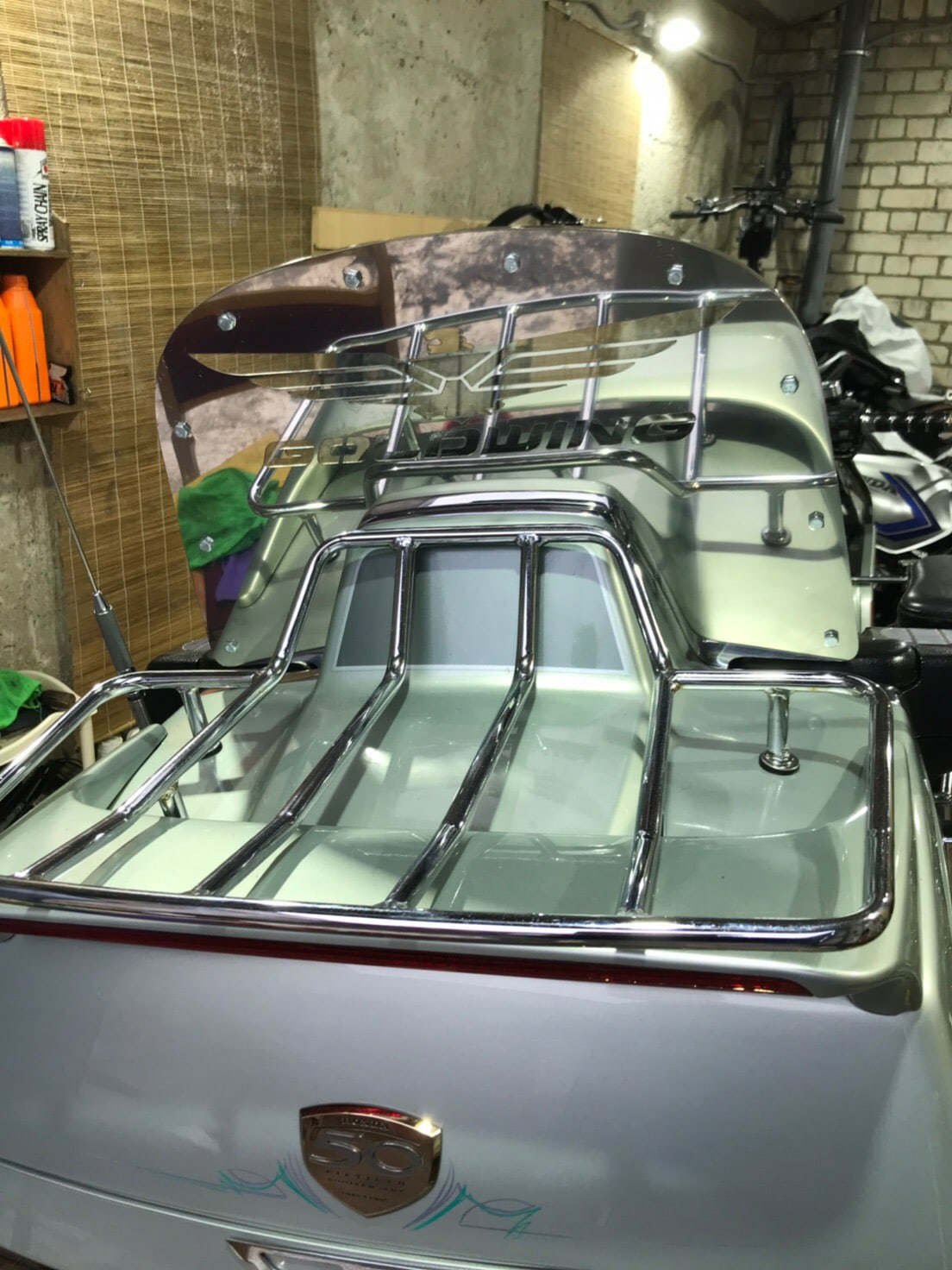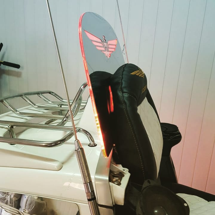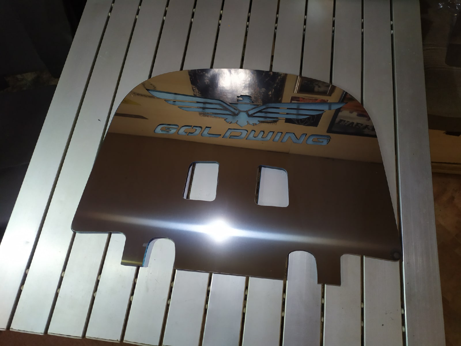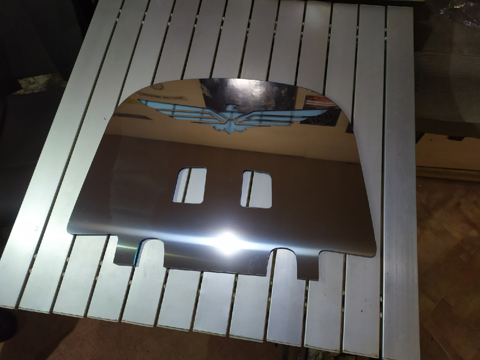Комплект лопаты (уже в сборе - склеенный) две хром накладки, посередине стекло. Устанавливается за спинкой пассажира и прижимается спинкой. Подсветки + 500 р.